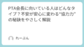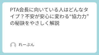 雑学 PTA会長に向いている人はどんなタイプ?不安が安心に変わる“協力力”の秘訣をやさしく解説 PTA会長という役割に少しでも興味があって、このページを開いてくださったのだと思います。「私にできるのかな?」「大変そう…」と不安を抱くのはとても自然なことです。でも実は、特別な才能や強いリーダーシップがなくても大丈夫なんです。大切なのは、... 雑学