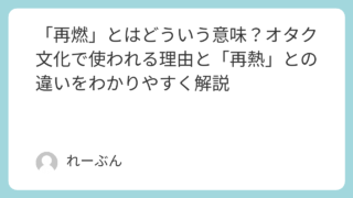 雑学 「再燃」とはどういう意味?オタク文化で使われる理由と「再熱」との違いをわかりやすく解説 “しばらく離れていたのに、ある日ふとまた好きになる”。 そんな気持ちの揺れ戻しを表す言葉として、SNSや推し活の中でよく使われるのが「再燃」と「再熱」です。どちらも“もう一度ハマる”という意味ですが、実はニュアンスや使われる場面が少しずつ違... 雑学