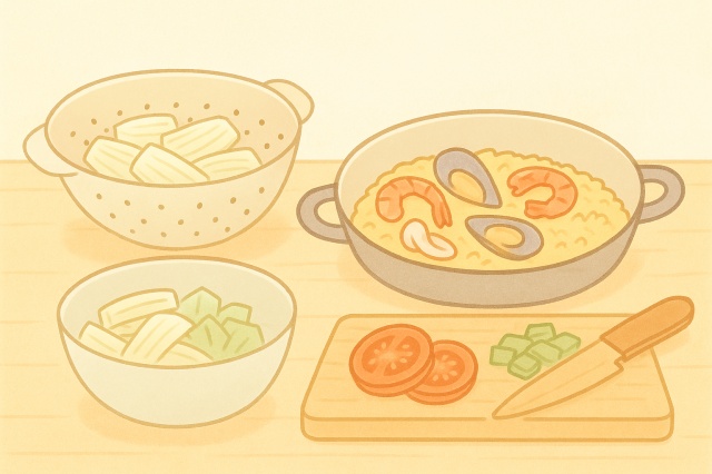 下処理を丁寧にすることで、具材から余計な水分が出るのを防ぎ、パエリア全体の食感が安定します。