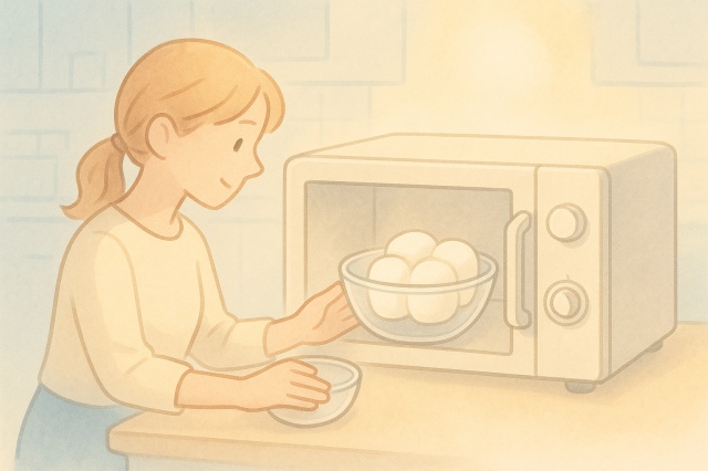 500Wで10〜20秒ずつが基本です。 短めの加熱を繰り返すことで、ふくらみすぎたり爆発したりするリスクを大きく減らせます。