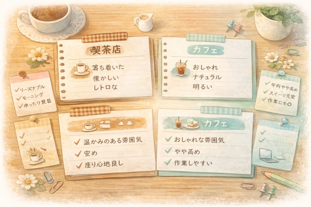 この記事では、喫茶店とカフェの違いを、初心者の方でも分かりやすいように順番に整理します。