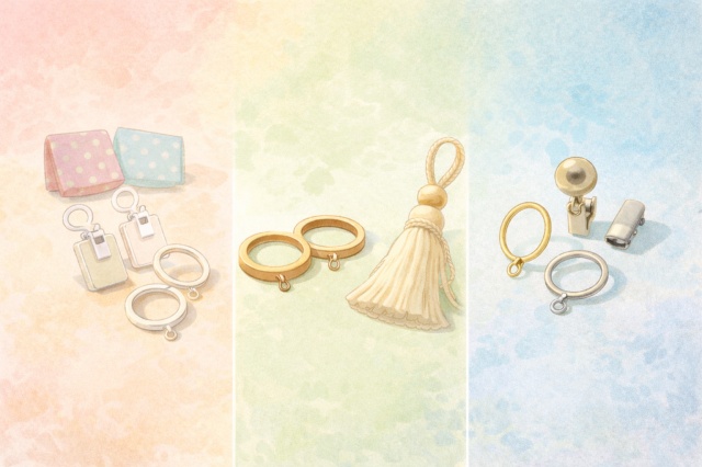 ダイソーやセリアでは、カーテンクリップ・リング・フックなど、基本的なグッズが豊富に揃っています。