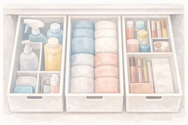 | 化粧小物 | 小分けボックスでカテゴリ別に | 使う順番で並べると時短に |