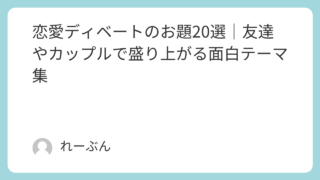 社会 恋愛ディベートのお題20選|友達やカップルで盛り上がる面白テーマ集 恋愛の話題って、なぜかどんな場面でも盛り上がりますよね。せっかくなら、その会話をもっと楽しく、深い時間にしてみませんか。この記事では、「恋愛ディベート」をテーマに、友達同士でもカップルでも楽しめる面白いお題を20個厳選しました。浮気・同棲・... 社会