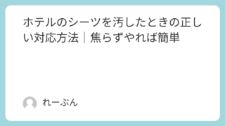 社会 ホテルのシーツを汚したときの正しい対応方法|焦らずやれば簡単 旅行中、ホテルのシーツをうっかり汚してしまった……そんな経験はありませんか?とっさの出来事に焦ってしまうかもしれませんが、大丈夫です。正しい対処法を知っていれば、トラブルを最小限に抑えることができます。この記事では、シーツを汚してしまったと... 社会