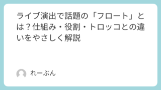 雑学 ライブ演出で話題の「フロート」とは?仕組み・役割・トロッコとの違いをやさしく解説 ライブに行ったとき、ステージとは別に大きな装置が会場内を動いているのを見たことはありませんか。それが「フロート」と呼ばれる演出装置です。初めて見ると何のためにあるのか分からず、気になる方も多いと思います。この記事では、ライブ初心者の方でも理... 雑学