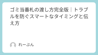 家庭 ゴミ当番札の渡し方完全版|トラブルを防ぐスマートなタイミングと伝え方 ゴミ当番札をどのタイミングで渡せばいいのか、迷ったことはありませんか。早めに渡した方がいいのか、それとも任期が終わるまで持っておくべきか――地域によって考え方が違うため、判断に悩む人は多いです。この記事では、「ゴミ当番札を渡す最適なタイミン... 家庭